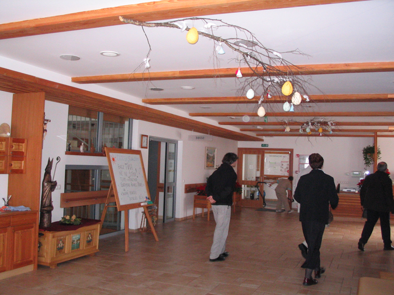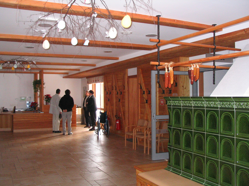 V zadnji etaži najvišjega dela je urejena manjša kapela. Oprema sprejemnega halla in kapele je izdelana po podrobnejšem načrtu iz macesnovega lesa skladno s tradicionalnim načinom obdelave, kot tradicionalen element je izdelana tudi kmečka peč kot simbol toplega zatočišča. Oprema ostalih prostorov je tipska, skladna z zahtevami za tovrstne objekte. Zunanja ureditev okrog objekta je podrejena njegovi funkciji. Tako so površine na nivoju pritličja pretežno parkovno urejene in namenjene zunanjemu druženju in počitku oskrbovancev. Zelenice so zasajene z grmovnicami, prostor ob klopeh zasenčen z drevesi. Lega na robu vasi ob sprehodih omogoča vedutne poglede na naravno okolje ter vizualno navezanost na vas.